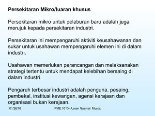 Oleh itu sarjana-sarjana ini berpendapat setiap usahawan perlu. PERSEKITARAN PERNIAGAAN DI MALAYSIA 1. The persekitaran mikro syarikat ia merujuk kepada semua faktor mikro yang mempengaruhi strategi membuat keputusan dan prestasi perniagaan.