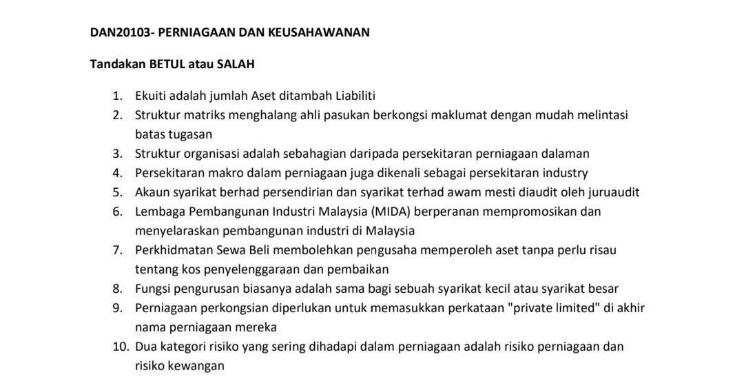 Dan20103 Perniagaan Dan Keusahawanan Tandakan Betul Chegg Com